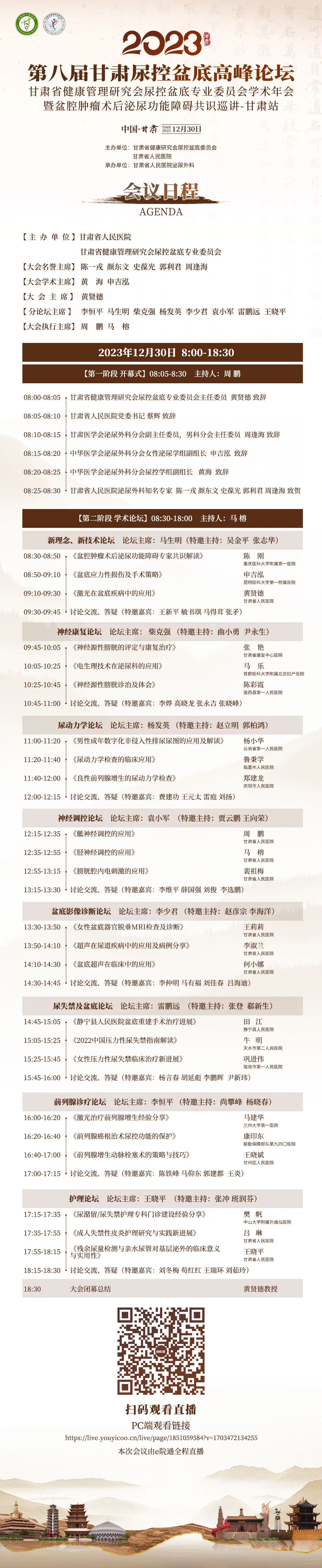 为了促进我省尿控及盆底疾病诊治的学术交流,提高我省尿控及盆底疾病的诊疗水平,推动学科发展,定于2023 年12月30日在兰州召开“第八届甘肃省尿控及盆底疾病高峰论坛”(线上) (项目编号:2023620405013,授予省级I类学分5分)。